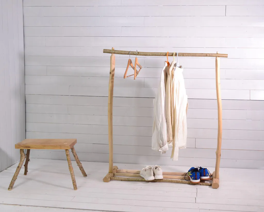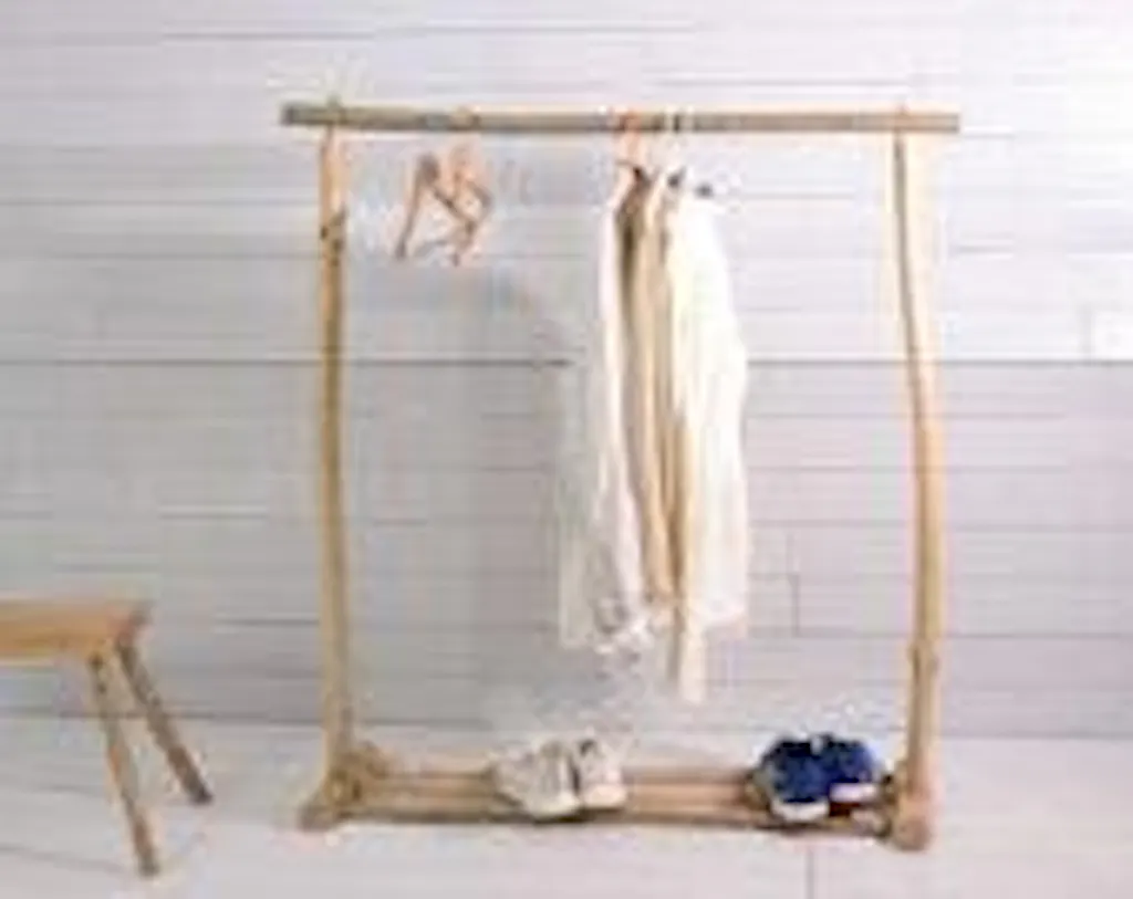 Bring warmth and simplicity to your space with this handcrafted clothing rack made of raw, solid wood. Designed with a triple slatted base, it offers both elegance and practicality, providing a space to neatly store shoes, baskets, or bags.