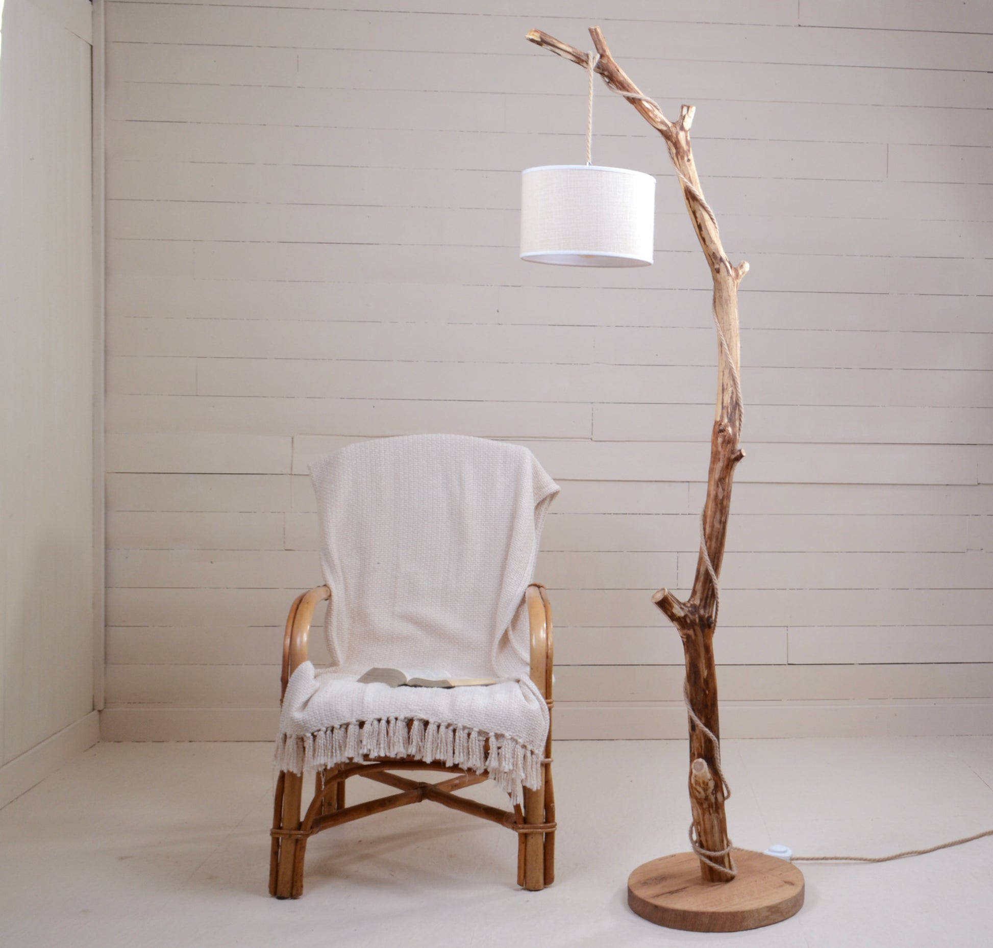 Lampadaire branche – bois naturel, cordon jue tressé, style artisanal bohème